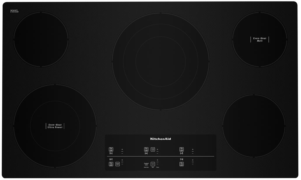 This 36" electric cooktop combines the lasting beauty of a black glass surface with the performance of a 10'' Even-Heat™ Ultra Power™ Element with Simmer Setting, two 6'' Even-Heat™ Elements with Melt Setting, and 12''/9''/6'' Triple-Ring Round Element that maximizes your flexibility with three distinct rings to allow for element selection based on cookware size.Read More