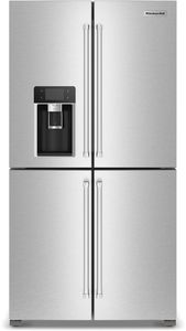 Designed with entertaining in mind, the KitchenAid® 4-Door Counter-Depth refrigerator with Exterior Ice and Water is the life of the party with its show-stopping interior, large capacity ice production, removable beverage caddy and more.Read More