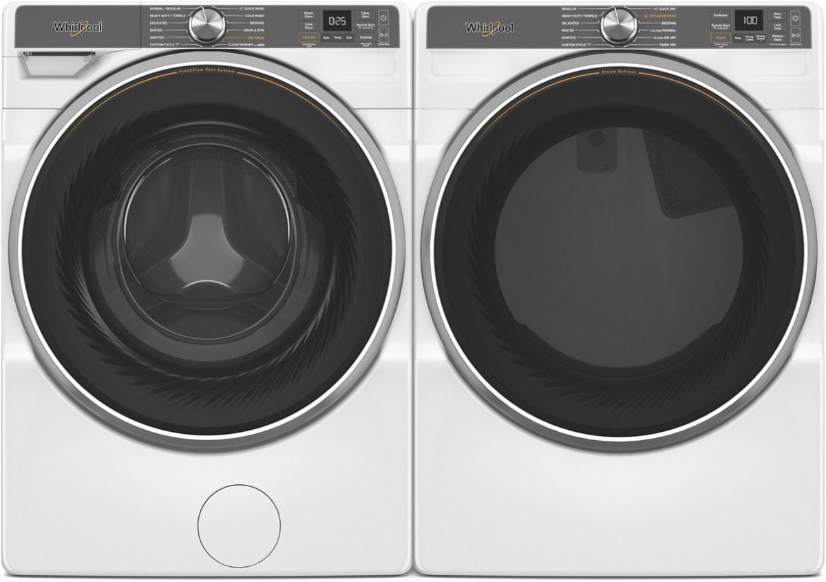 Whirlpool® White Front Load Laundry Pair with a 5.0 cu. ft. capacity front load washer and a 7.4 cu. ft. capacity front load electric dryer.Read More