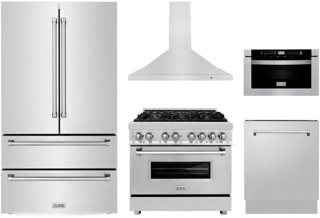 ZLINE 5 Piece Stainless Steel Kitchen Package with freestanding dual fuel range, wall mounted range hood, built in dishwasher, counter depth french door refrigerator, and microwave drawerRead More