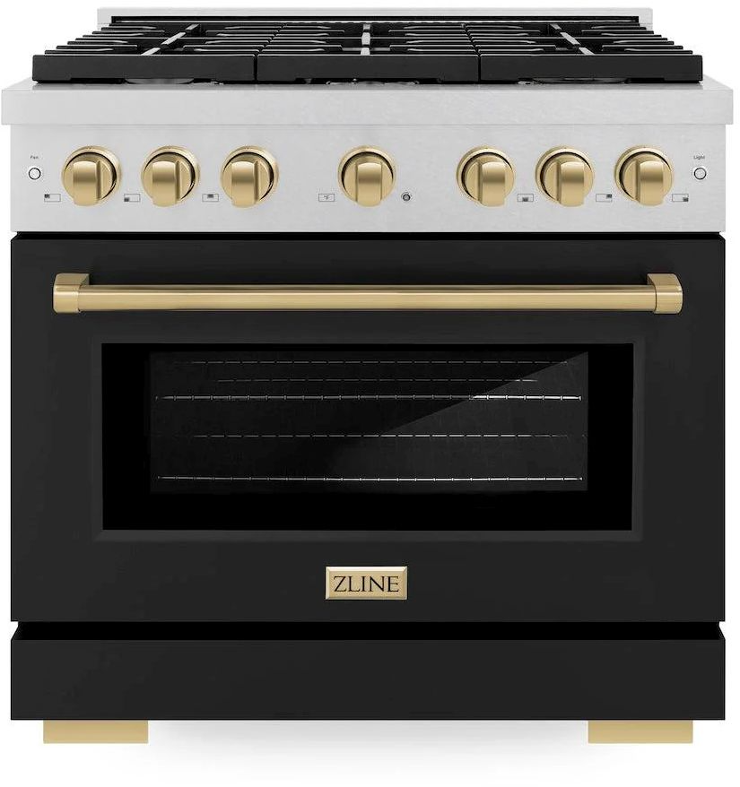 The ZLINE Autograph Edition 36 in. 5.2 cu. ft. Paramount Gas Range with 6 Burner Cooktop and Convection Gas Oven in Satin Stainless Steel with Black Matte Door and Champagne Bronze Accents (SGRSZ-BLM-36-CB) features a versatile gas cooktop with 6 Italian-made auto-reignition burners, a high-performing gas convection oven, enhanced cast iron grates, a beautiful black matte door with a Horizon window design, and elegant champagne bronze knobs and handle allowing you to master every meal.