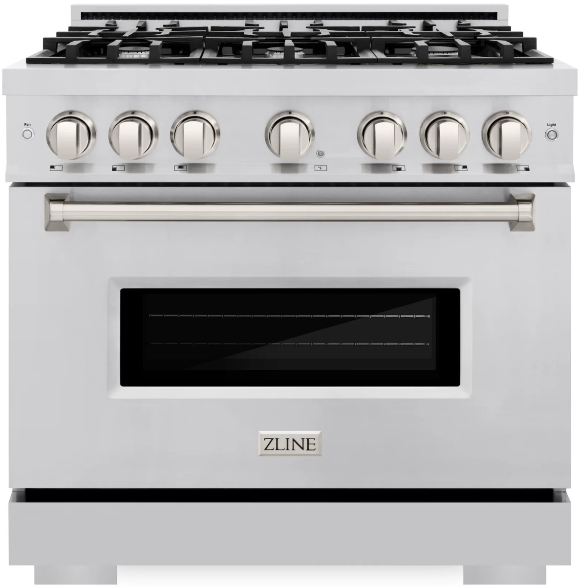 The ZLINE 36 in. 5.2 cu. ft. Classic Dual Fuel Range with 6 Burner Gas Cooktop and Electric Convection Oven in Stainless Steel (CDR36) combines the elegance of a hand-finished porcelain gas cooktop with 6 Italian-made auto-reignition burners, an electric convection oven with an energy-efficient cooling fan to ensure quiet operation, and a Landscape oven door window design allowing you to master every meal.