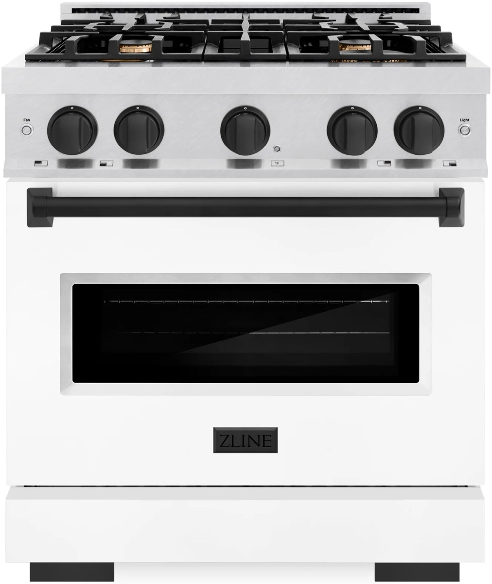 The ZLINE Autograph Edition 30 in. 4.2 cu. ft. Classic Dual Fuel Range with 4 Burner Gas Cooktop and Electric Convection Oven in Satin Stainless Steel with White Matte Door and Matte Black Accents (CDRSZ-WM-30-MB) combines the elegance of a hand-finished porcelain gas cooktop with 4 Italian-made auto-reignition burners, an electric convection oven with an energy-efficient cooling fan to ensure quiet operation, a beautiful white matte door with a Landscape window design, and stunning matte black knobs and handle allowing you to master every meal.