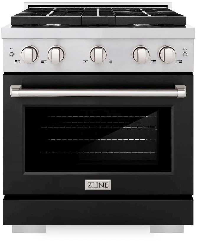 The ZLINE 30 in. 4.2 cu. ft. Paramount Dual Fuel Range with 4 Burner Gas Cooktop and Electric Convection Oven in Stainless Steel with Black Matte Door (SDR-BLM-30) combines the versatility of a gas cooktop with 4 Italian-made auto-reignition burners, an electric convection oven with digital thermostat technology, enhanced cast iron grates, and a beautiful black matte door with a Horizon window design allowing you to master every meal.