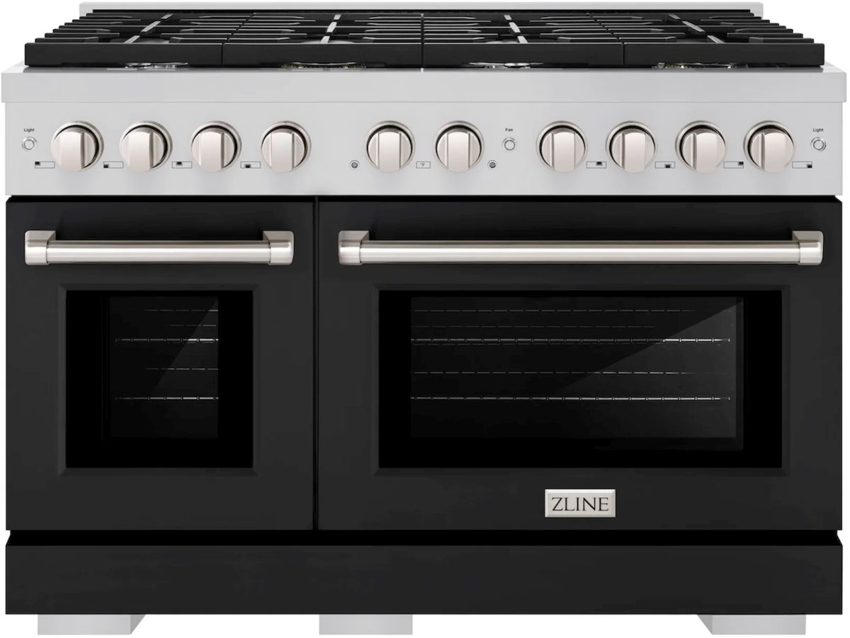 The ZLINE 48 in. 6.7 cu. ft. Paramount Double Oven Dual Fuel Range with 8 Burner Gas Cooktop in Stainless Steel with Black Matte Doors (SDR-BLM-48) combines the versatility of a gas cooktop with 8 Italian-made auto-reignition burners, a large high-performing electric convection oven and a small bake-and-broil oven with digital thermostat technology, enhanced cast iron grates, and beautiful black matte doors with Horizon window designs allowing you to master every meal.