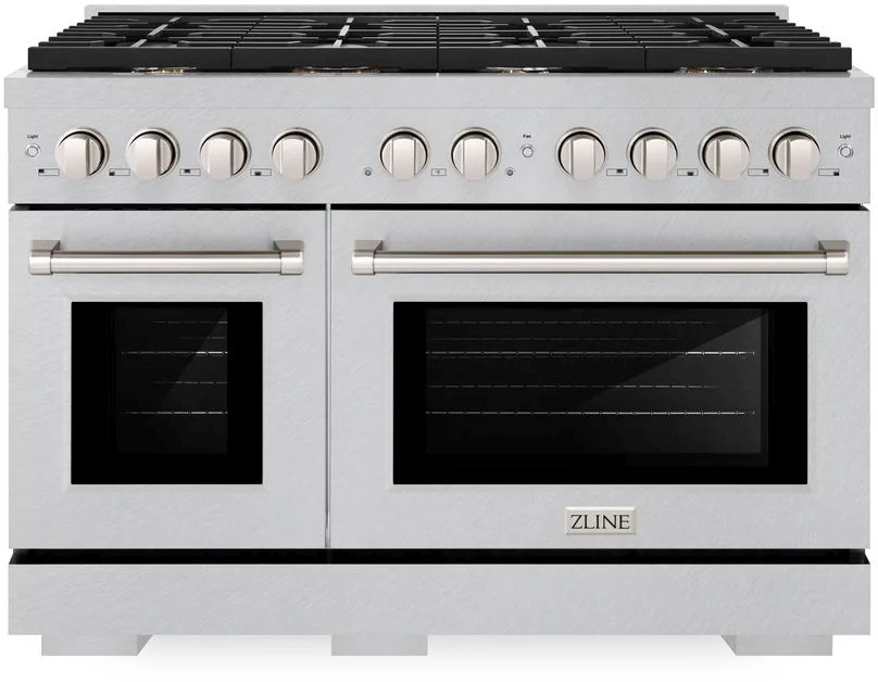 The ZLINE 48 in. 6.7 cu. ft. Paramount Double Oven Dual Fuel Range in Satin Stainless Steel with 8 Brass Burners (SDRS-BR-48) combines the versatility of a gas cooktop with 8 Italian-made brass auto-reignition burners, a large high-performing electric convection oven and a small bake-and-broil oven with digital thermostat technology, enhanced cast iron grates, and Horizon oven door window designs allowing you to master every meal.