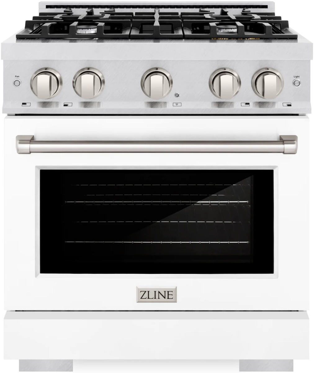 The ZLINE 30 in. 4.2 cu. ft. Select Gas Range with 4 Burner Cooktop and Convection Gas Oven in Satin Stainless Steel with White Matte Door (HGRS-WM-30) combines the elegance of a hand-finished porcelain gas cooktop with 4 Italian-made auto-reignition burners, a gas convection oven with an energy-efficient cooling fan to ensure quiet operation, and a beautiful white matte door with a Horizon window design allowing you to master every meal.