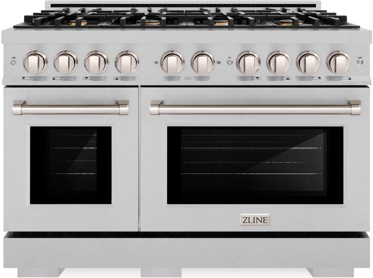 The ZLINE 48 in. 6.7 cu. ft. Select Double Oven Gas Range in Satin Stainless Steel with 8 Brass Burners (HGRS-BR-48) combines the elegance of a hand-finished porcelain gas cooktop with 8 Italian-made brass auto-reignition burners, a large gas convection oven with an energy-efficient cooling fan to ensure quiet operation, a small baking oven, and Horizon oven door window designs allowing you to master every meal.