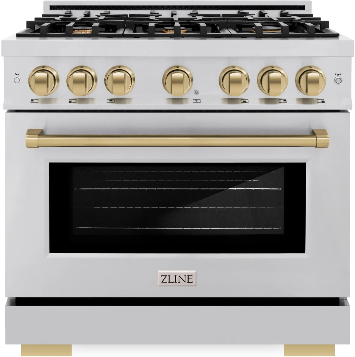 The ZLINE Autograph Edition 36 in. 5.2 cu. ft. Select Dual Fuel Range with 6 Burner Gas Cooktop and Electric Convection Oven in Stainless Steel with Champagne Bronze Accents (HDRZ-36-CB) combines the elegance of a hand-finished porcelain gas cooktop with 6 Italian-made auto-reignition burners, an electric convection oven with an energy-efficient cooling fan to ensure quiet operation, a Horizon oven door window design, and stunning champagne bronze knobs and handle allowing you to master every meal.